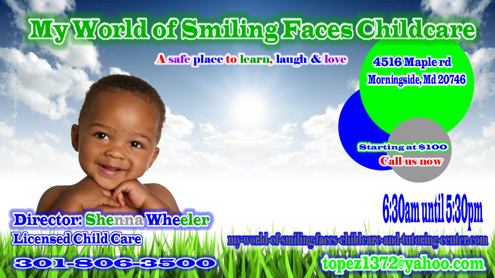 Now you can find out what's happening at My World of Smiling Faces Childcare Center and Tutoring Before and After Childcare Center - on the internet! We hope you have lots of fun with our new, informative website.